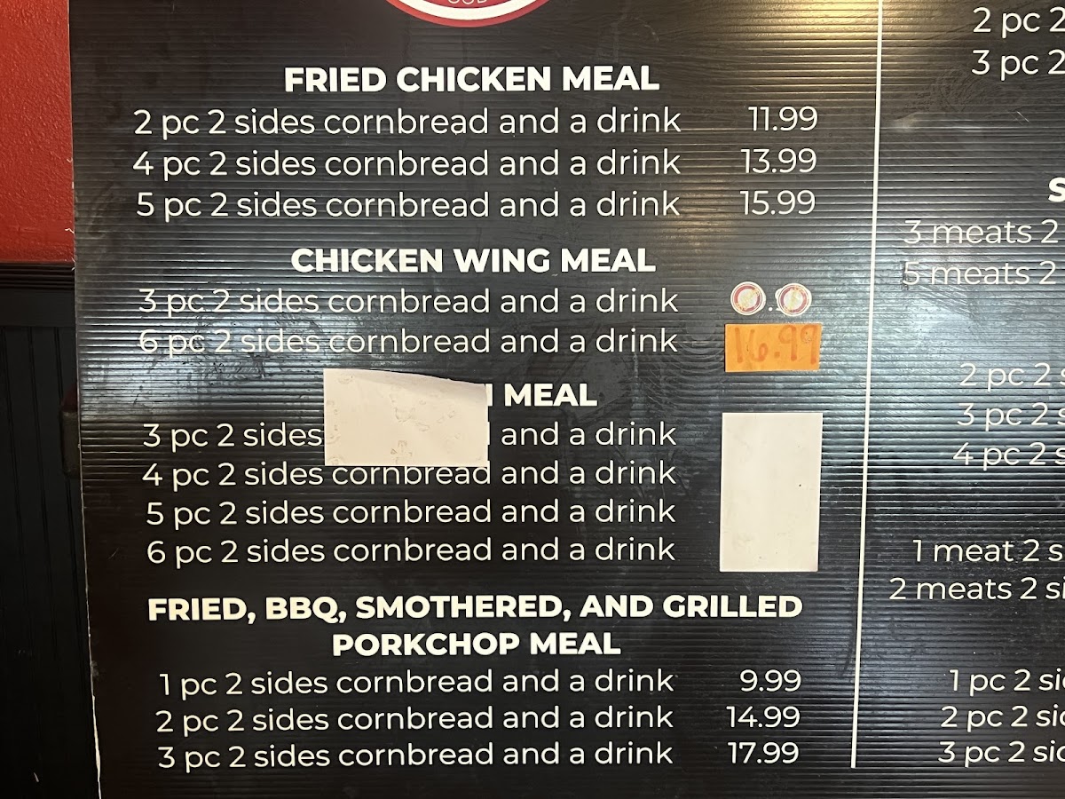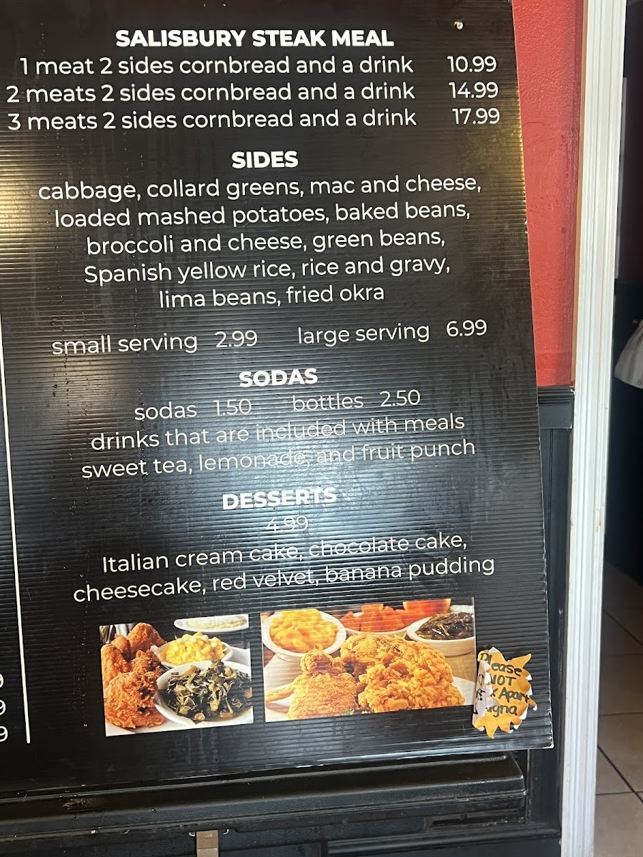 The offerings range from fried catfish paired with creamy macaroni and cheese and tender collard greens, to turkey wings and savory fried pork chops served alongside classic sides like rice and gravy or green beans. Meals come with your choice of two sides and drink, making it easy to customize your plate to match your appetite and mood.